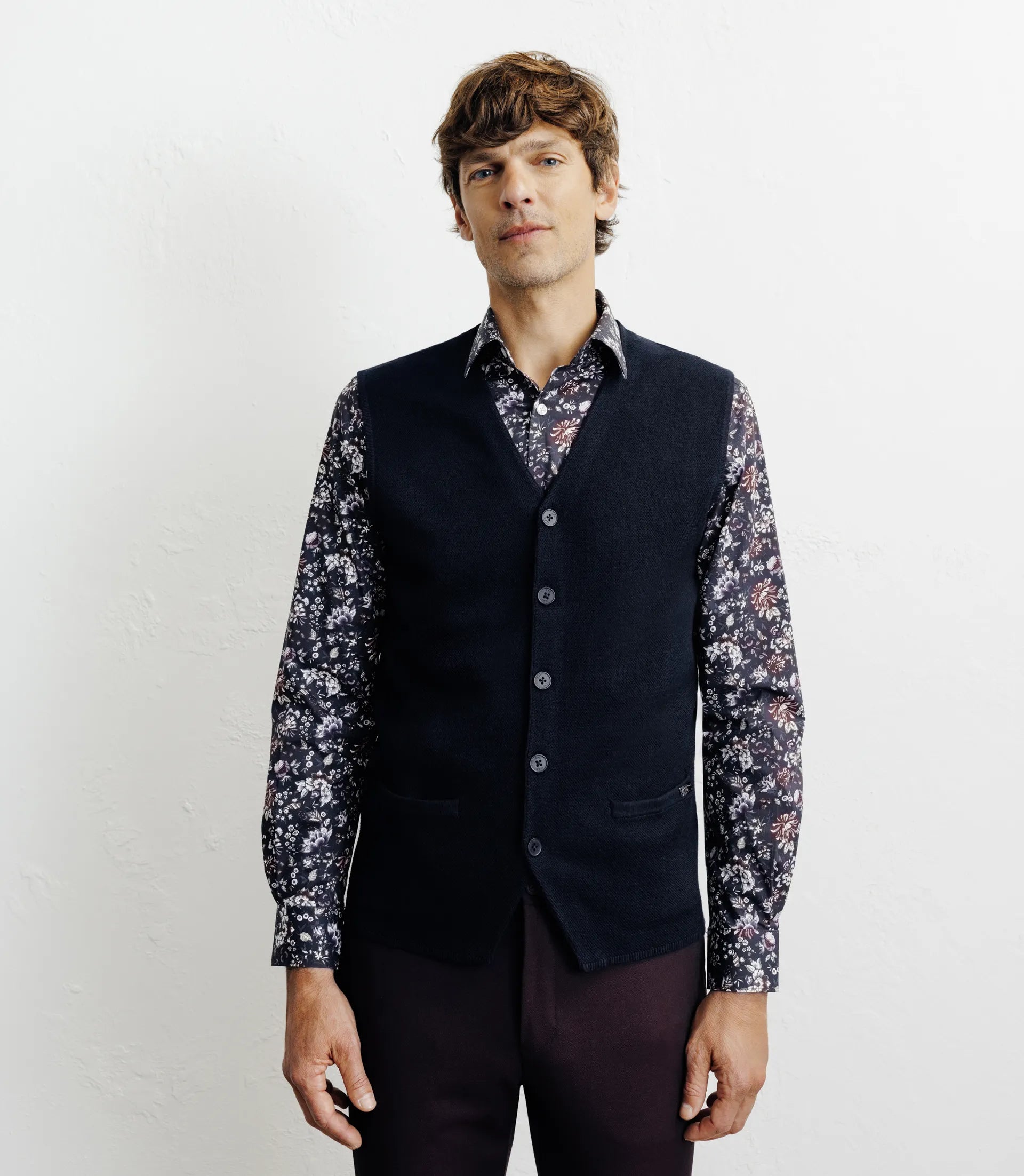 - Sleeveless vest with front button fastening